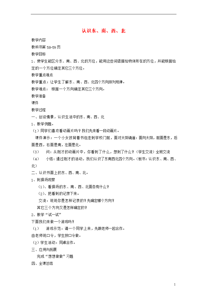 教案-全国-2013_二年级数学上册 认识东南西北教案 苏教版