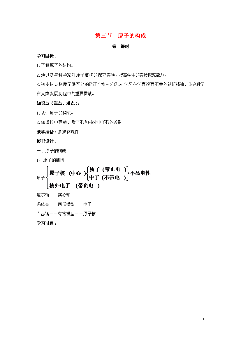 教案-全国-2018_九年级化学上册 第二单元 探秘水世界 第三节 原子的构成(第1课时)同步教案 (新版)鲁教版