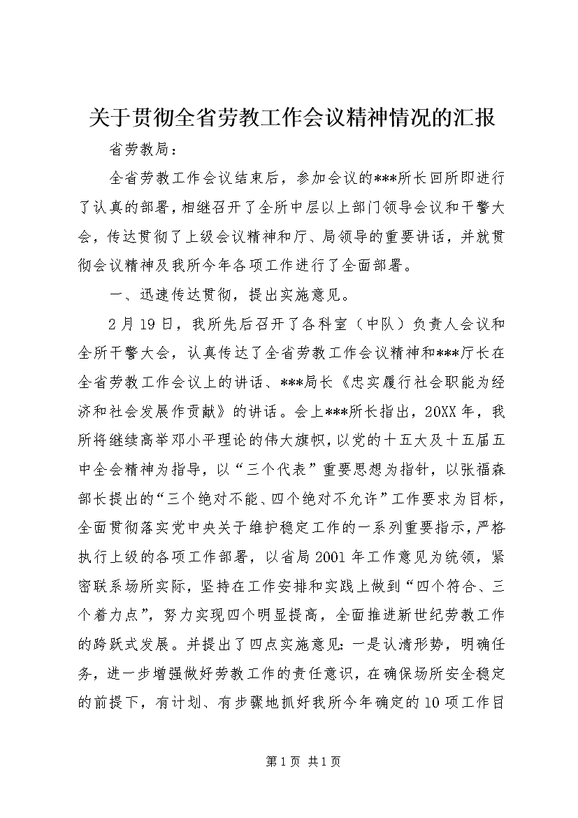 关于贯彻全省劳教工作会议精神情况的汇报 (2)
