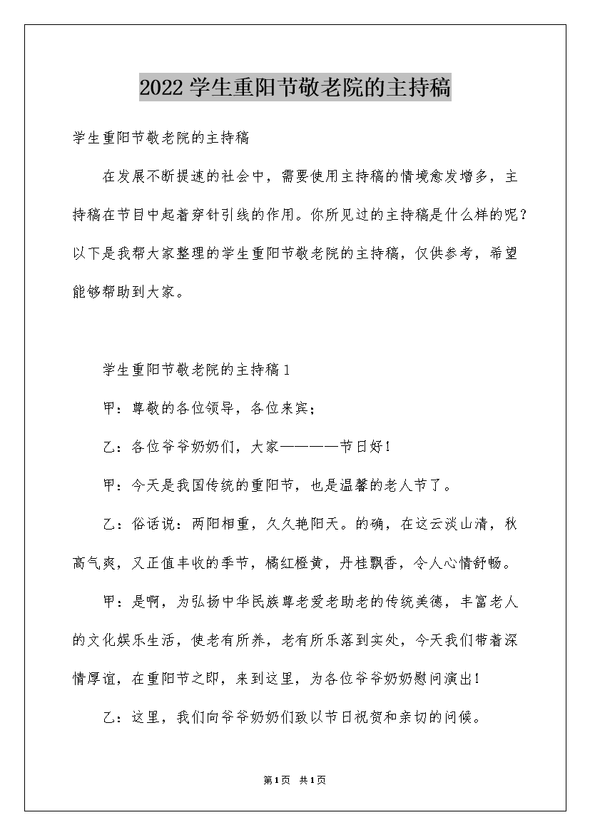 2022学生重阳节敬老院的主持稿