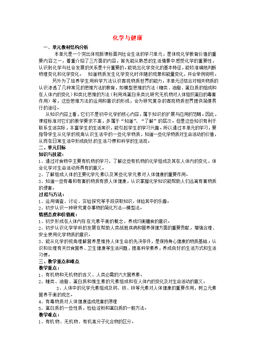 教案-山东-2018_山东省莱州市沙河镇九年级化学全册 第五单元 化学与健康教案 鲁教版五四制