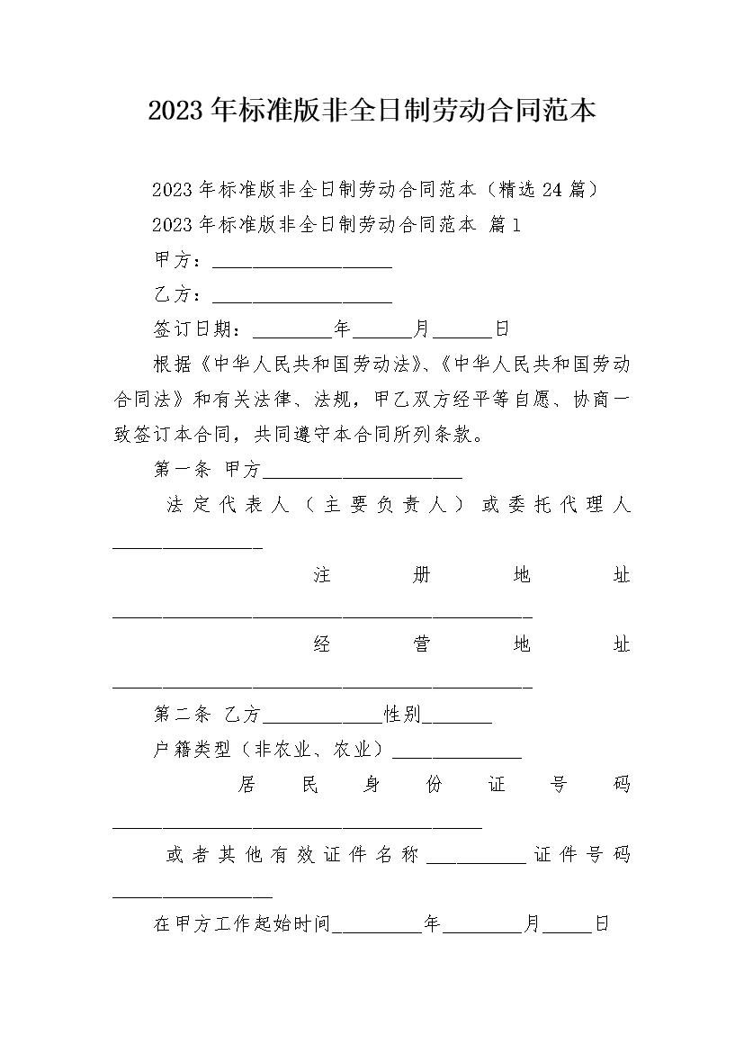 2023年标准版非全日制劳动合同范本