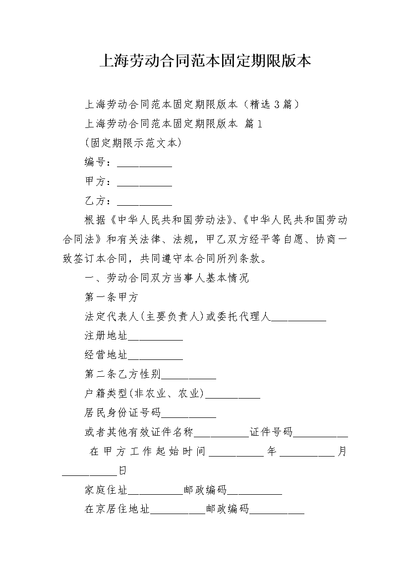 上海劳动合同范本固定期限版本