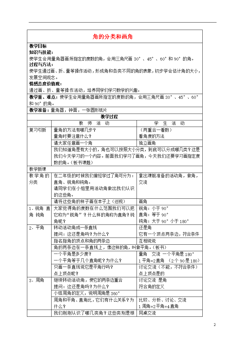 教案-全国-2011_四年级数学上册 角的分类和画角教案1 苏教版
