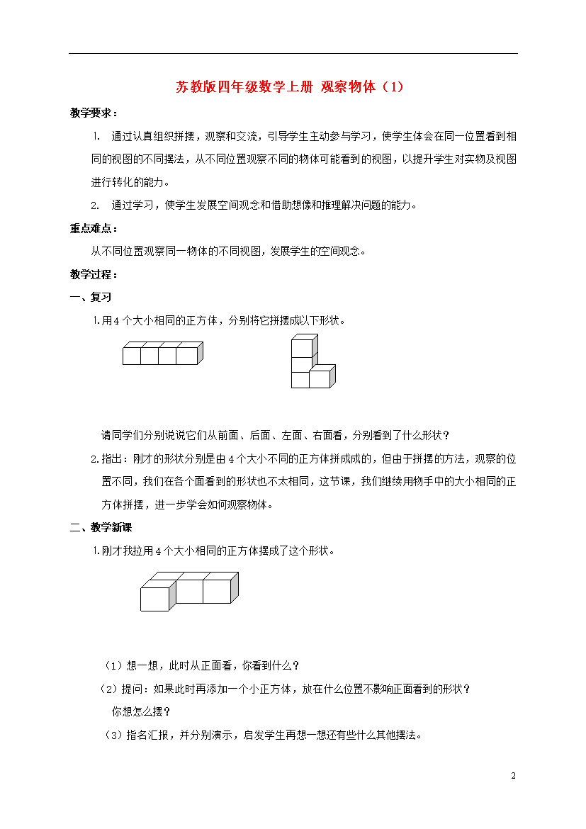 教案-全国-2011_四年级数学上册 观察物体(1)教案 苏教版