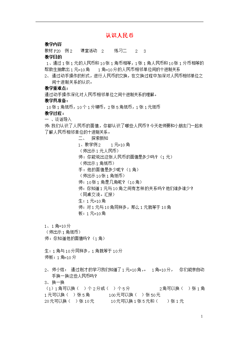 教案-全国-2017_2017春一年级数学下册 5《认识人民币》教案9 (新版)西师大版