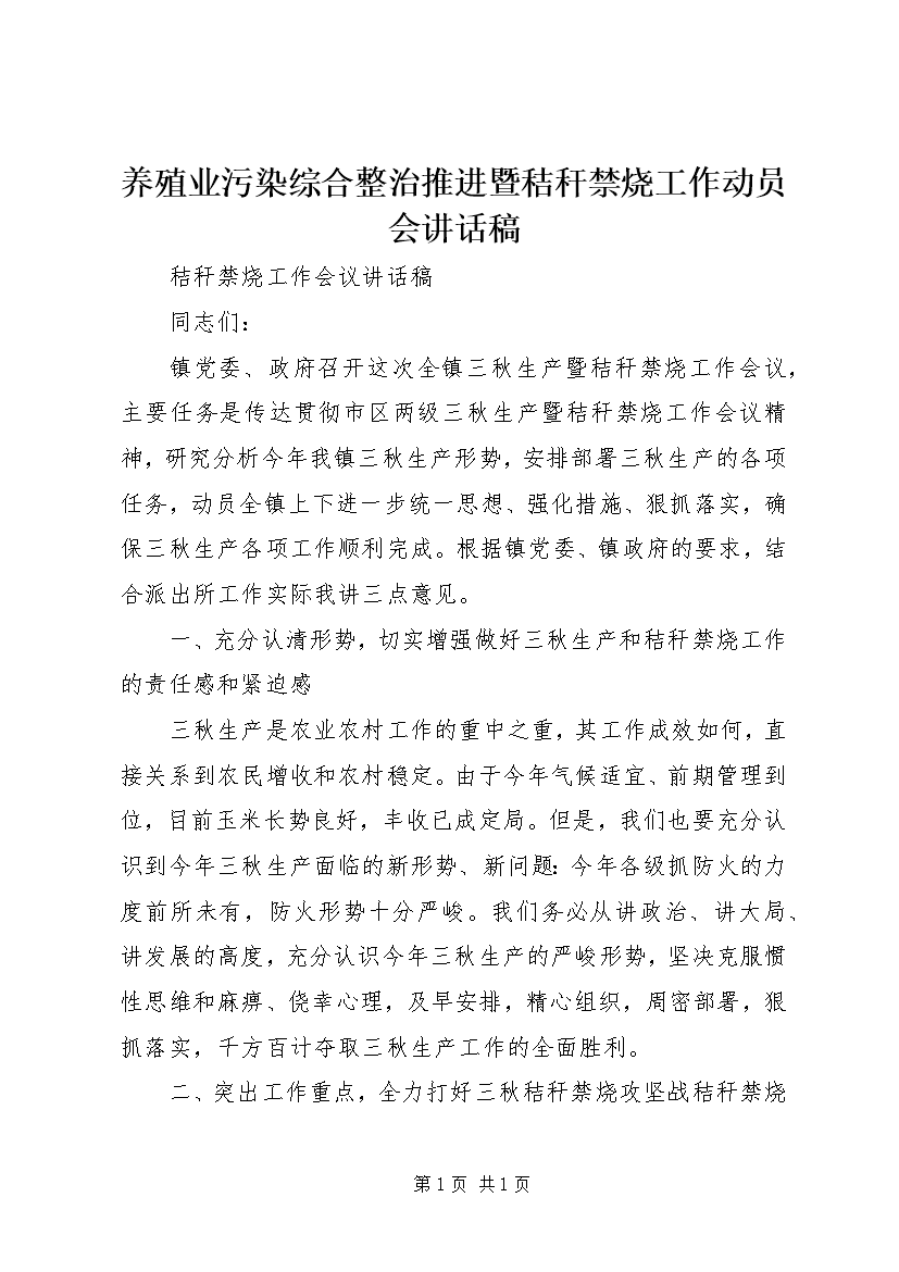养殖业污染综合整治推进暨秸秆禁烧工作动员会讲话稿 (2)
