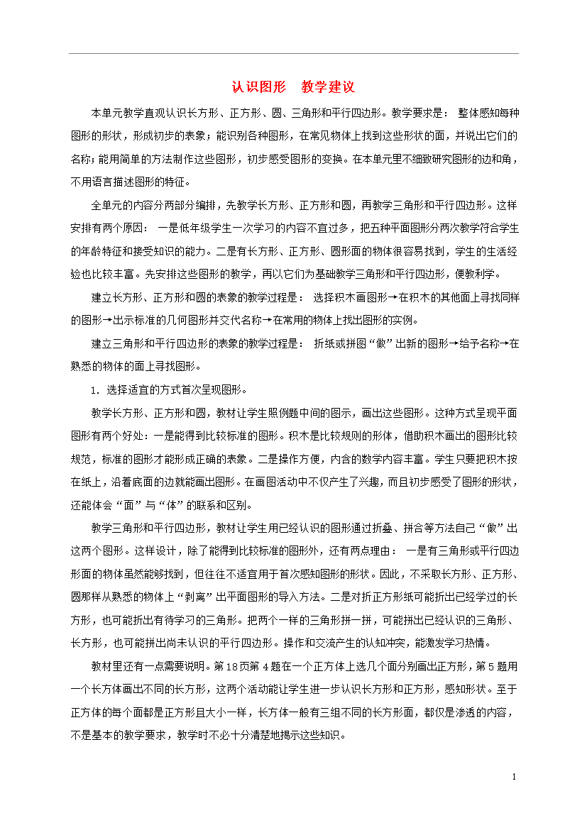 教案-全国-2012_一年级数学下册 认识图形教学建议 苏教版
