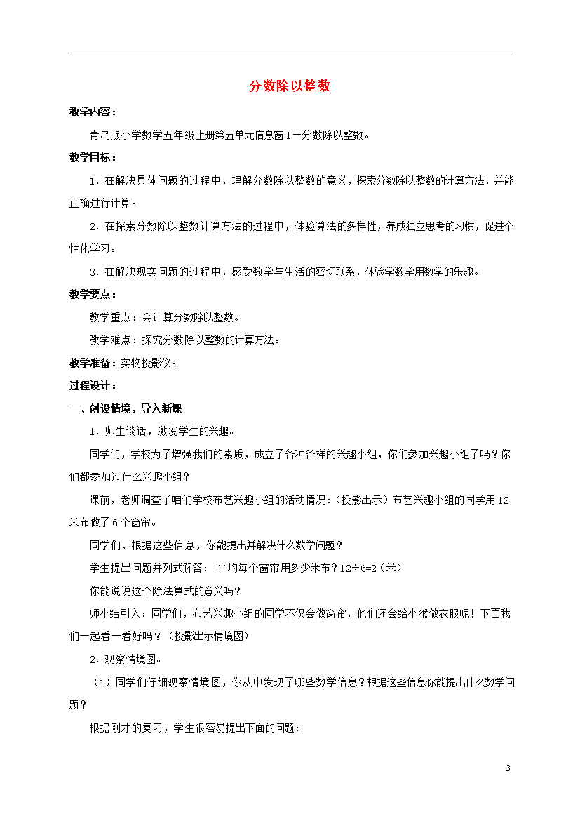 教案-全国-2011_五年级数学上册 分数除以整数 1教案 青岛版五年制