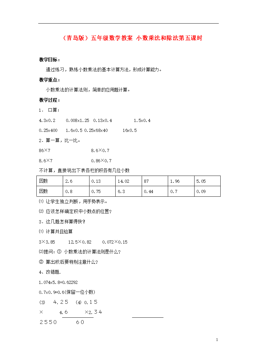 教案-全国-2011_五年级数学 小数乘法和除法第五课时教案 青岛版