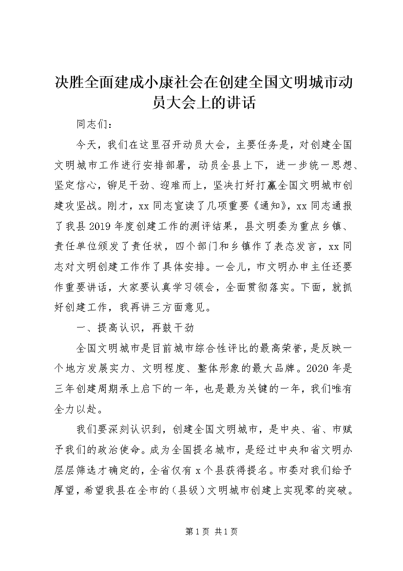 决胜全面建成小康社会在创建全国文明城市动员大会上的讲话