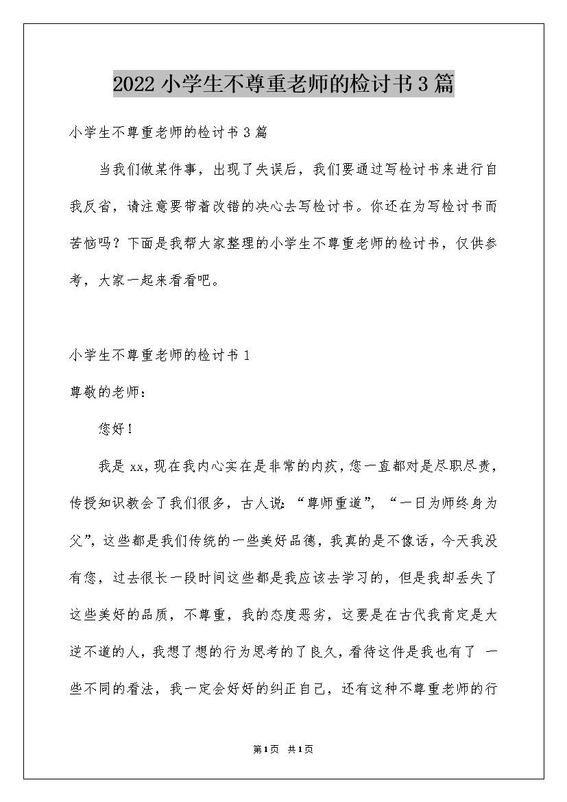2022小学生不尊重老师的检讨书3篇