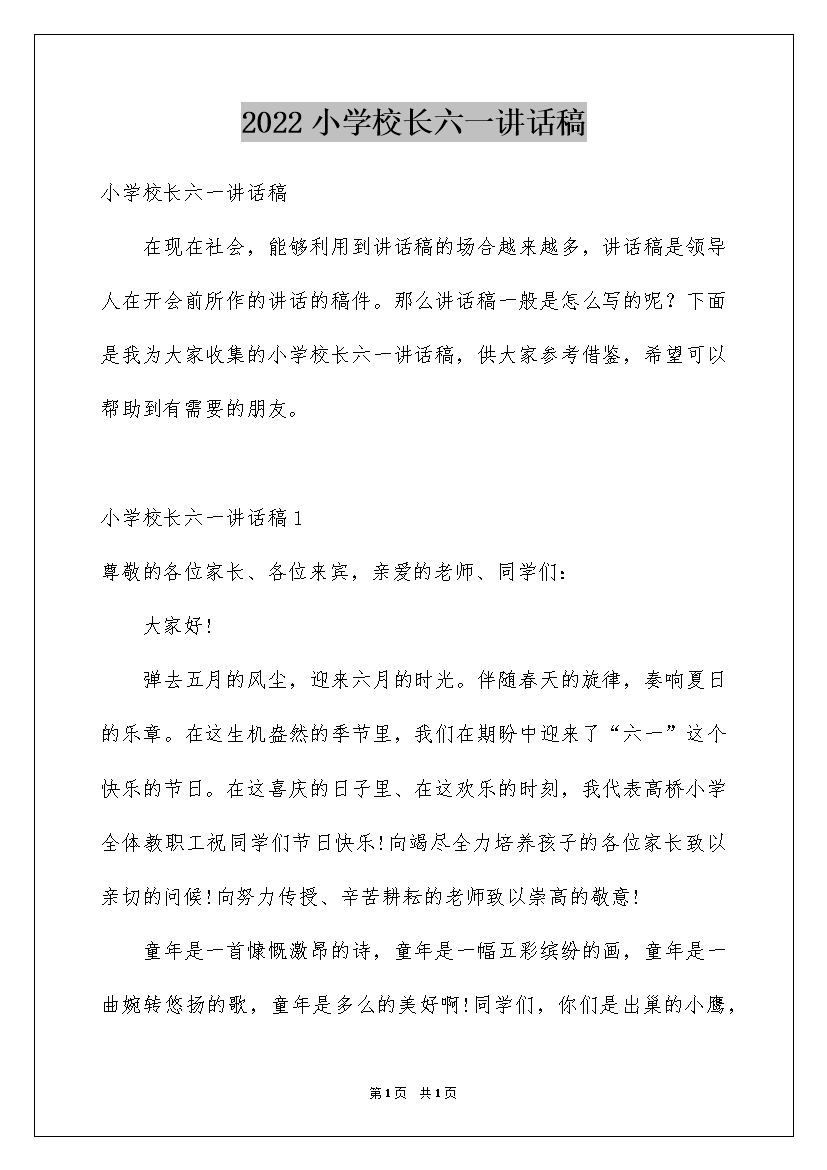 2022小学校长六一讲话稿