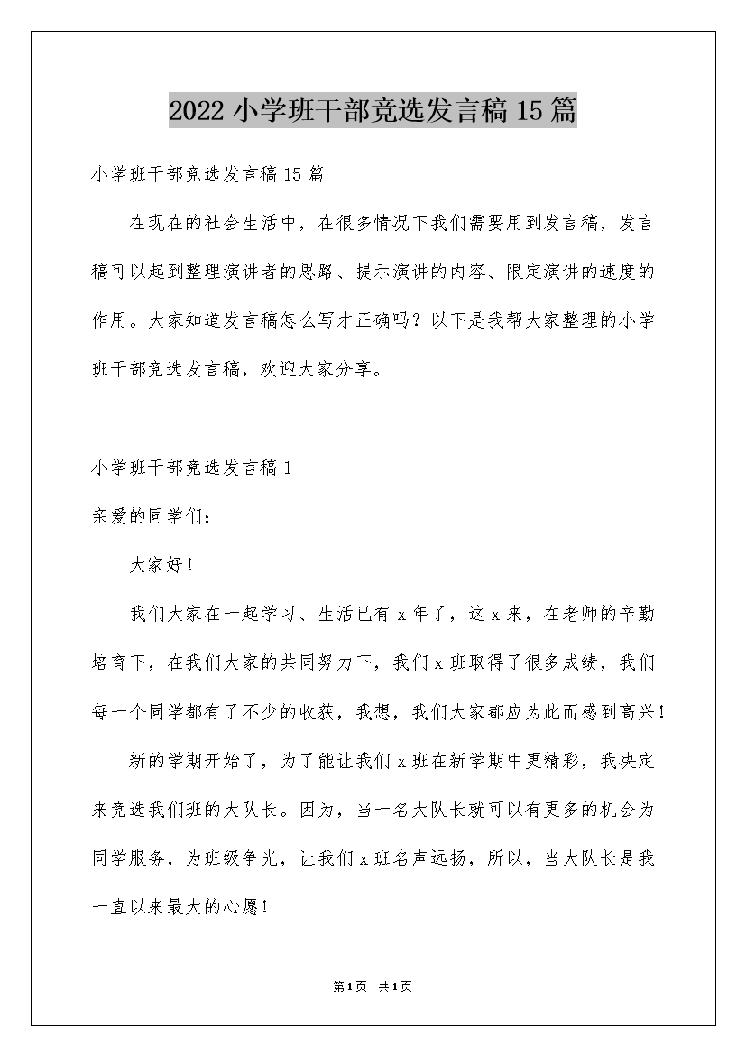 2022小学班干部竞选发言稿15篇