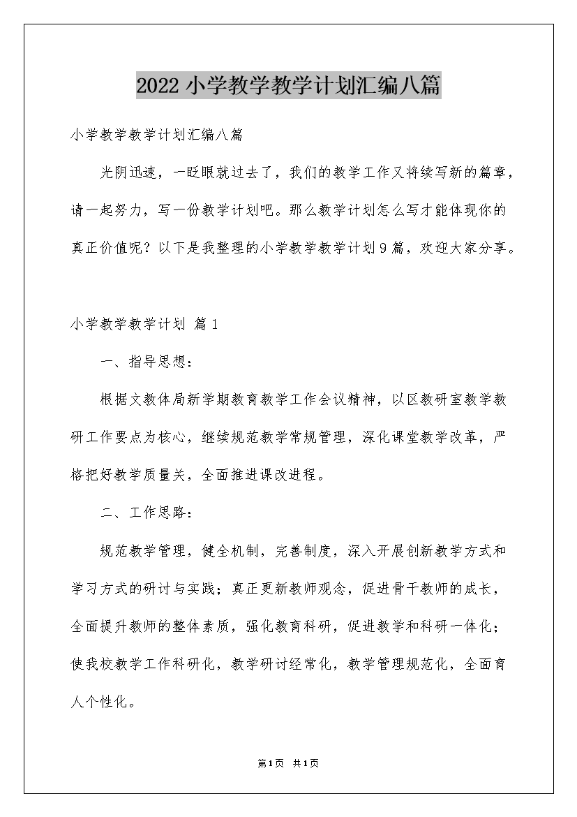 2022小学教学教学计划汇编八篇