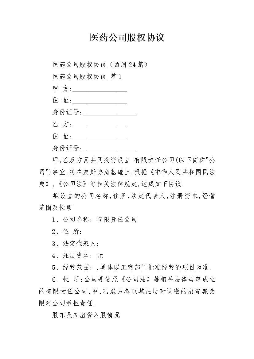 医药公司股权协议