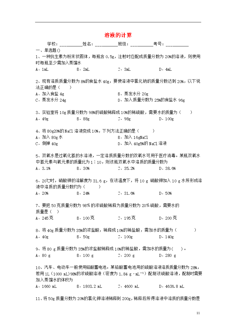 试题-全国-2014_2014年中考化学二轮精品复习 溶液的计算(含答案和解析)