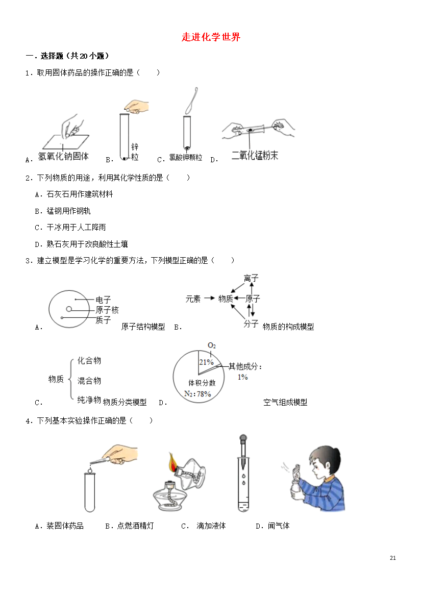 试题-全国-2020_2020届中考化学一轮复习 走进化学世界专题强化练习卷(含解析)