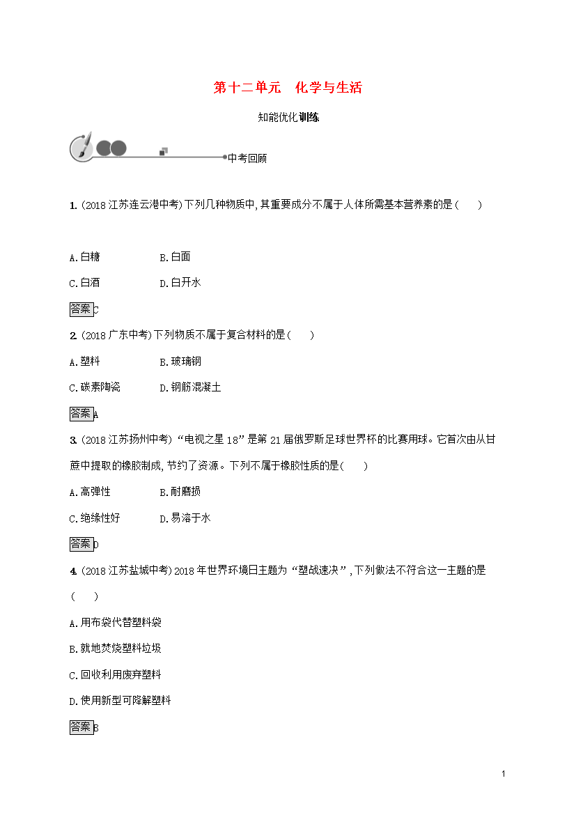 试题-全国-2019_中考化学总复习优化设计 第一板块 基础知识过关 第十二单元 化学与生活知能优化训练