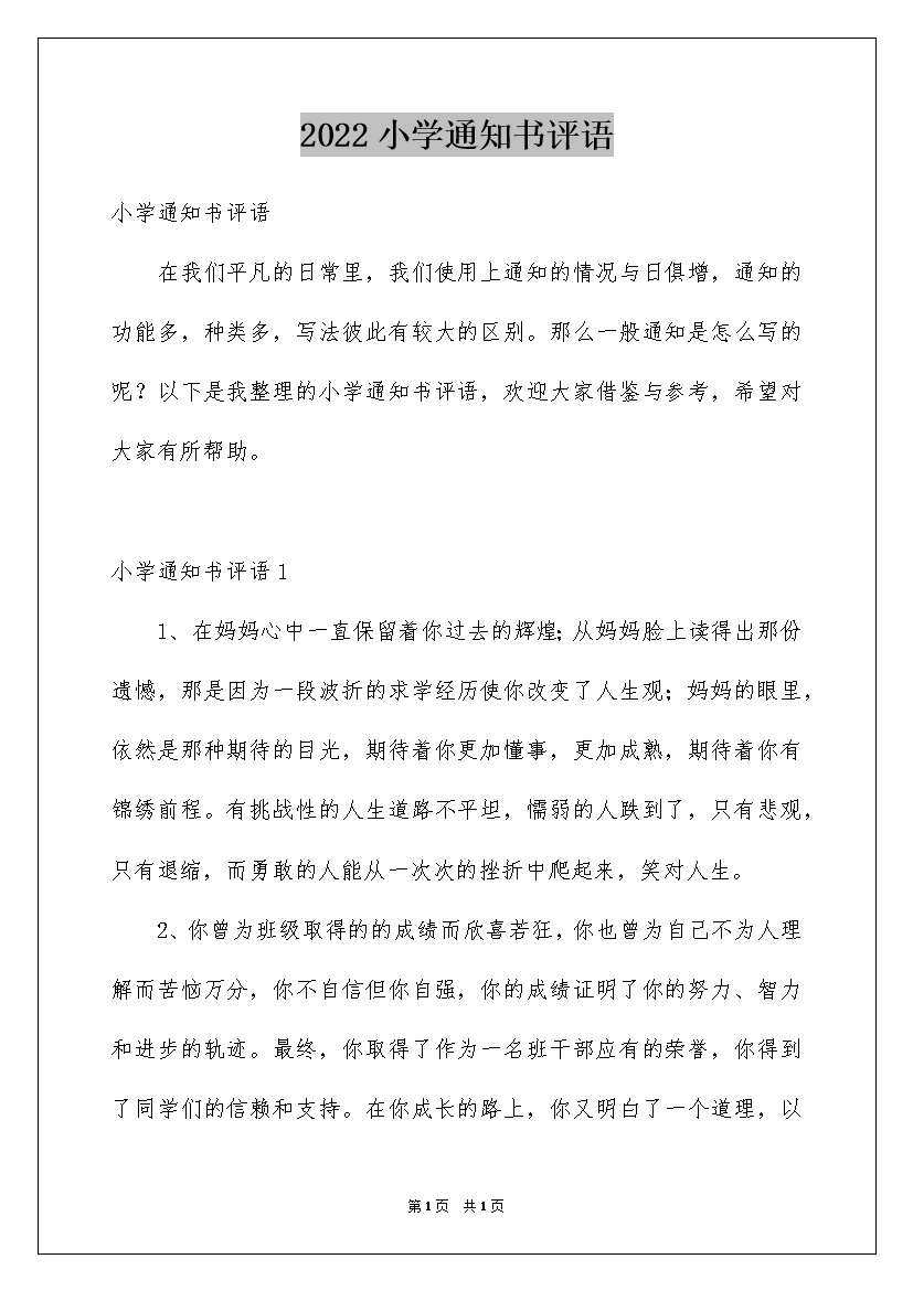 2022小学通知书评语