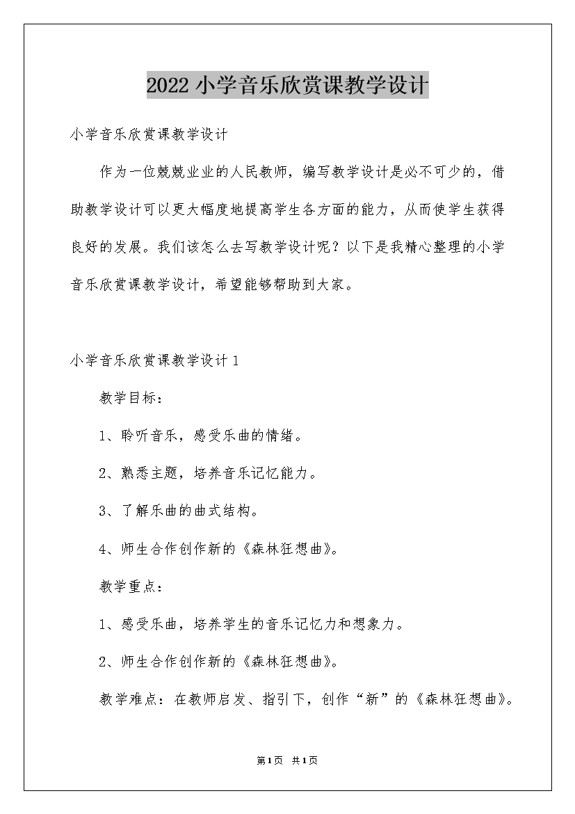 2022小学音乐欣赏课教学设计