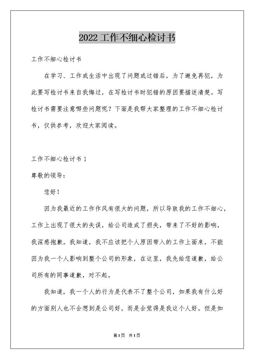 2022工作不细心检讨书