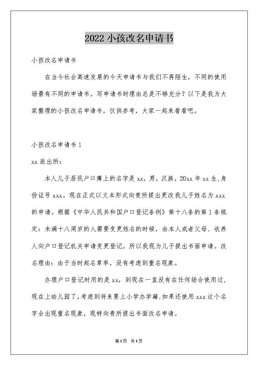 2022小孩改名申请书