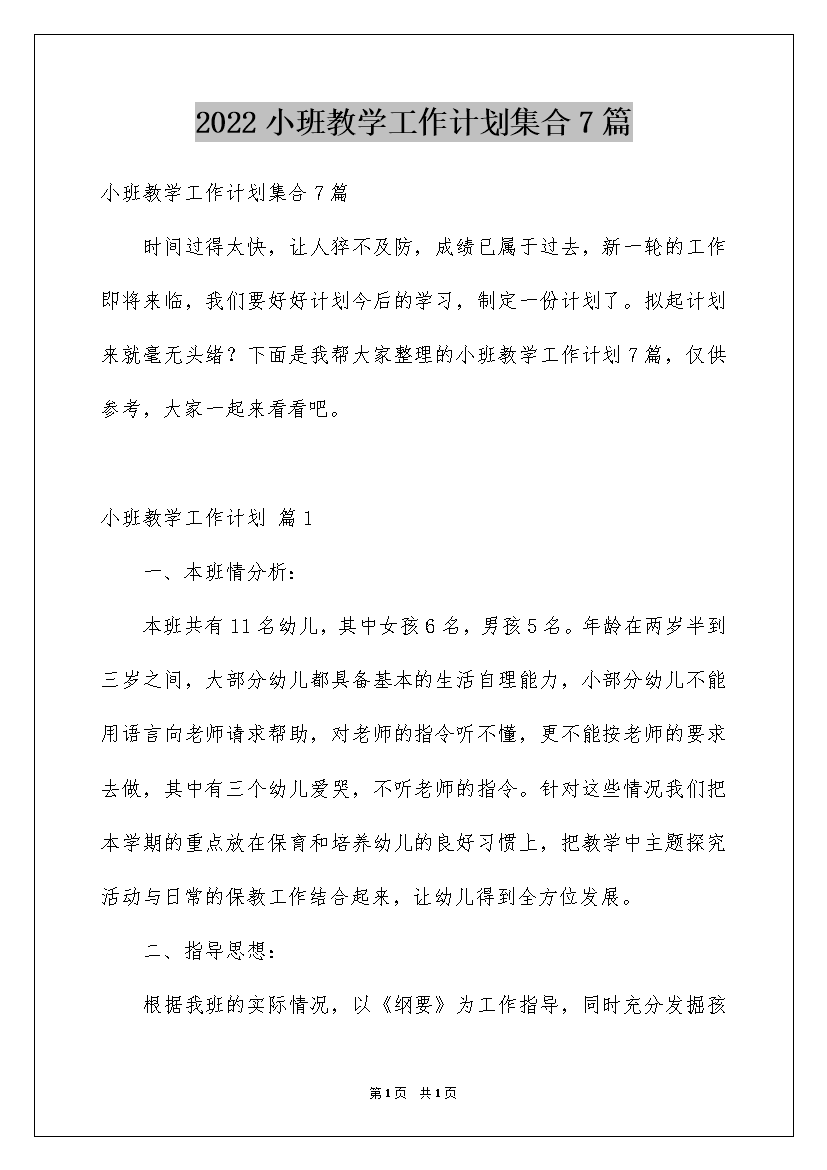 2022小班教学工作计划集合7篇