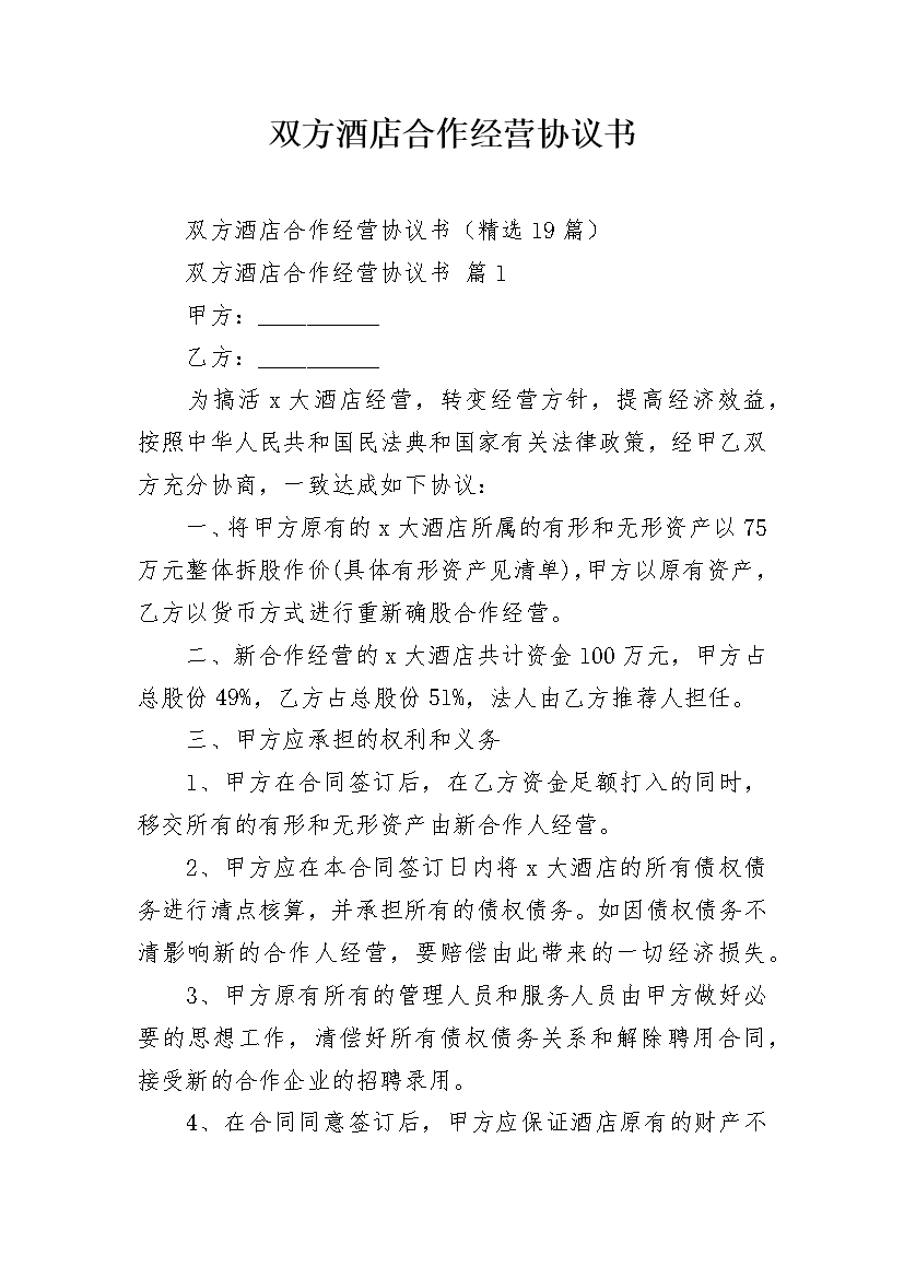 双方酒店合作经营协议书