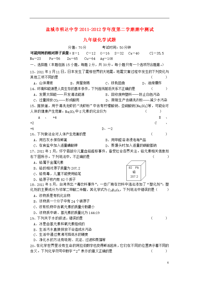 试题-江苏-2012_江苏省盐城市明达中学20011-2012学年度九年级化学第二学期期中测试试题