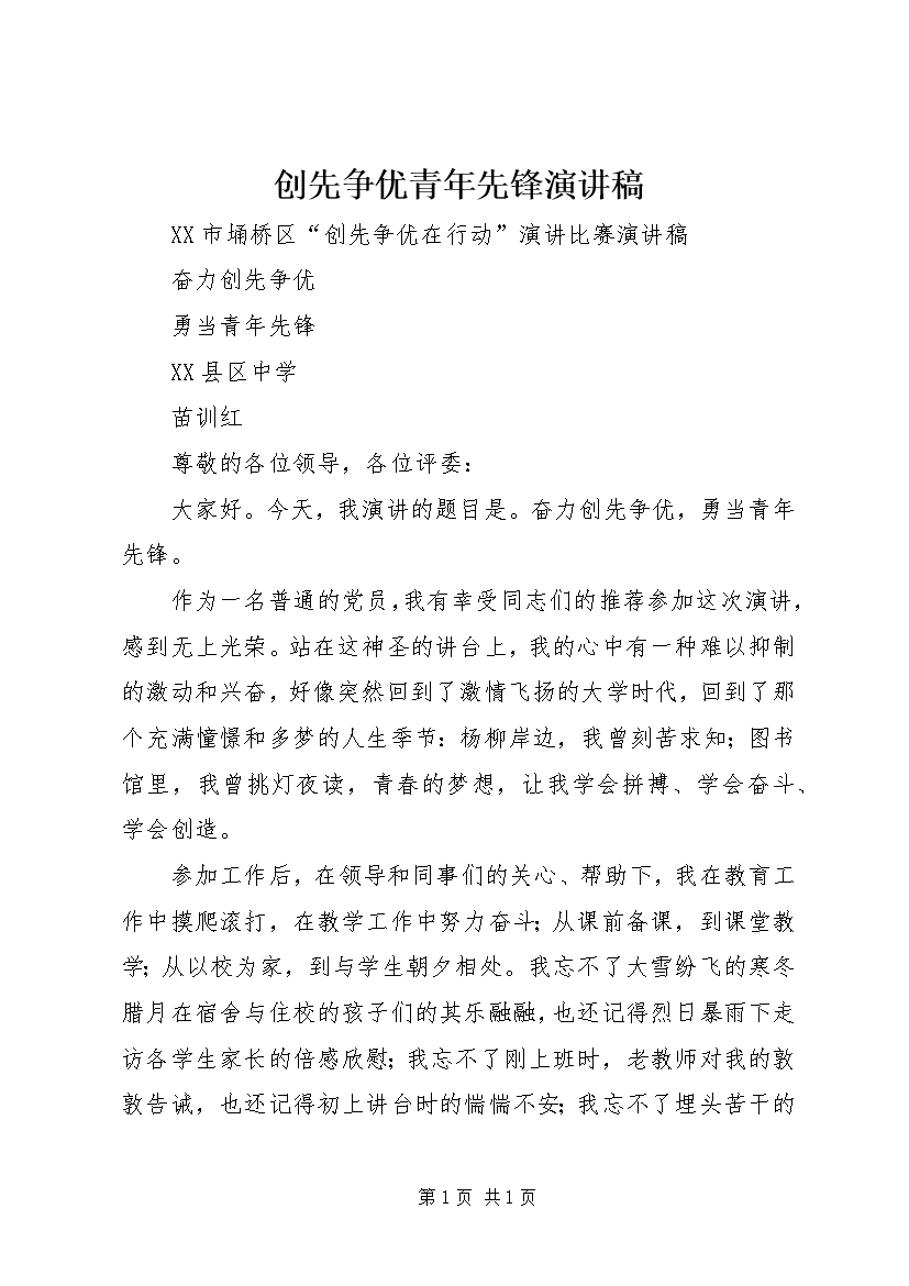 创先争优青年先锋演讲稿