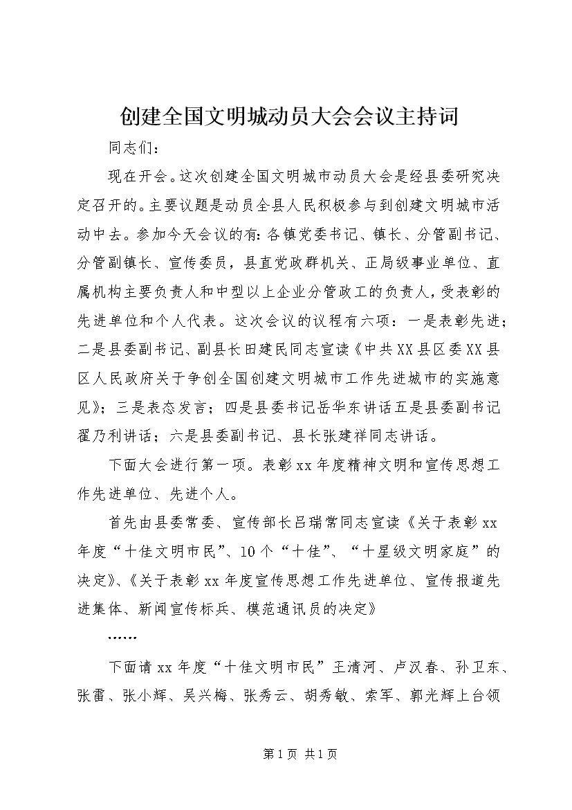 创建全国文明城动员大会会议主持词 (3)