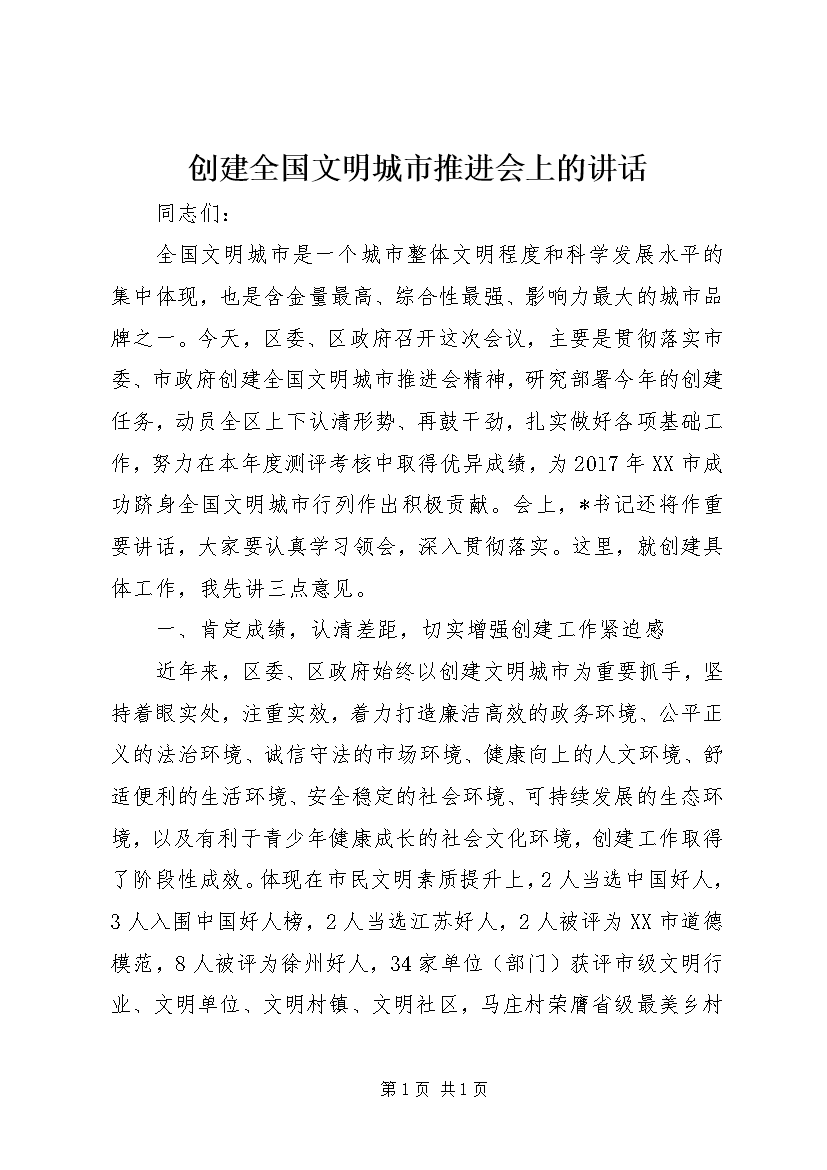 创建全国文明城市推进会上的讲话