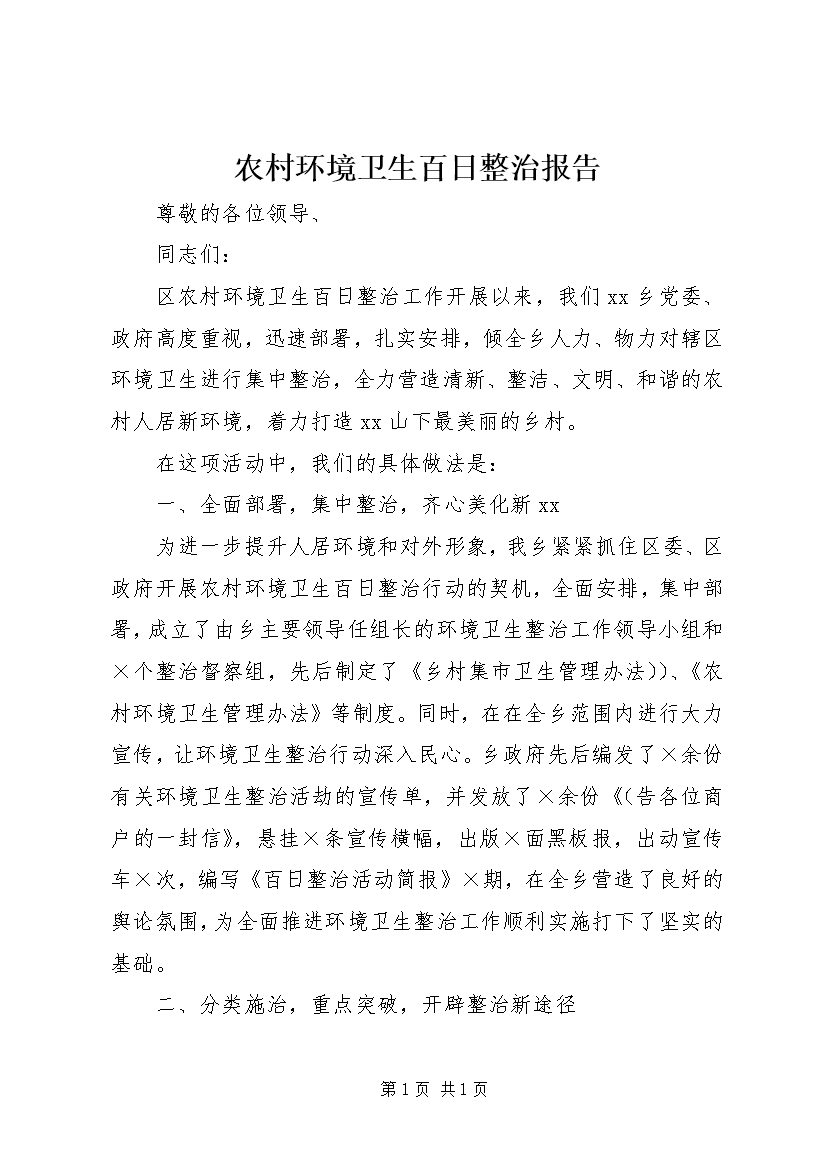 农村环境卫生百日整治报告