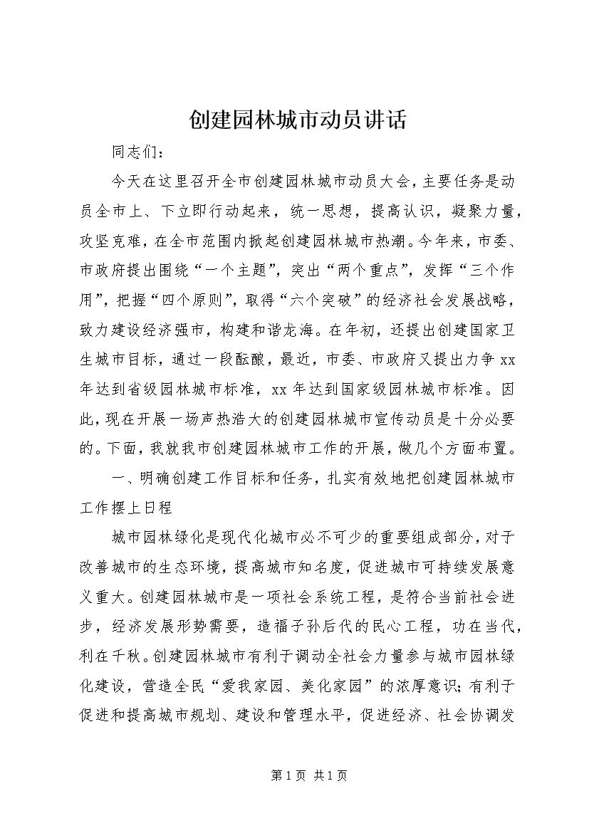 创建园林城市动员讲话