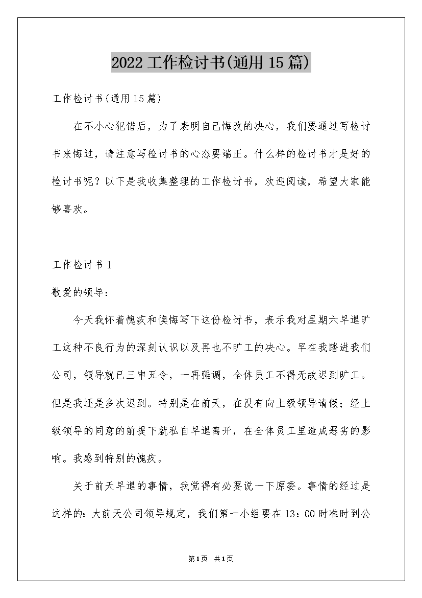 2022工作检讨书(通用15篇)