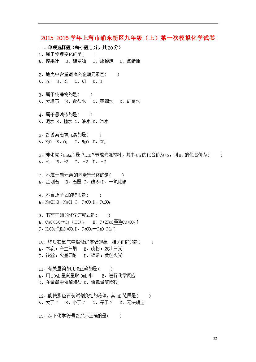 试题-上海-2016_上海市浦东新区2016届九年级化学上学期第一次模拟试题(含解析)
