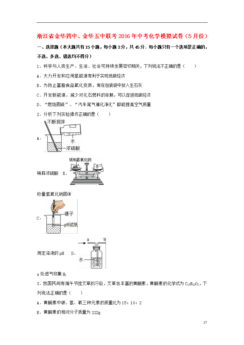 试题-浙江-2016_浙江省金华四中、金华五中联考2016年中考化学5月模拟试卷(含解析)