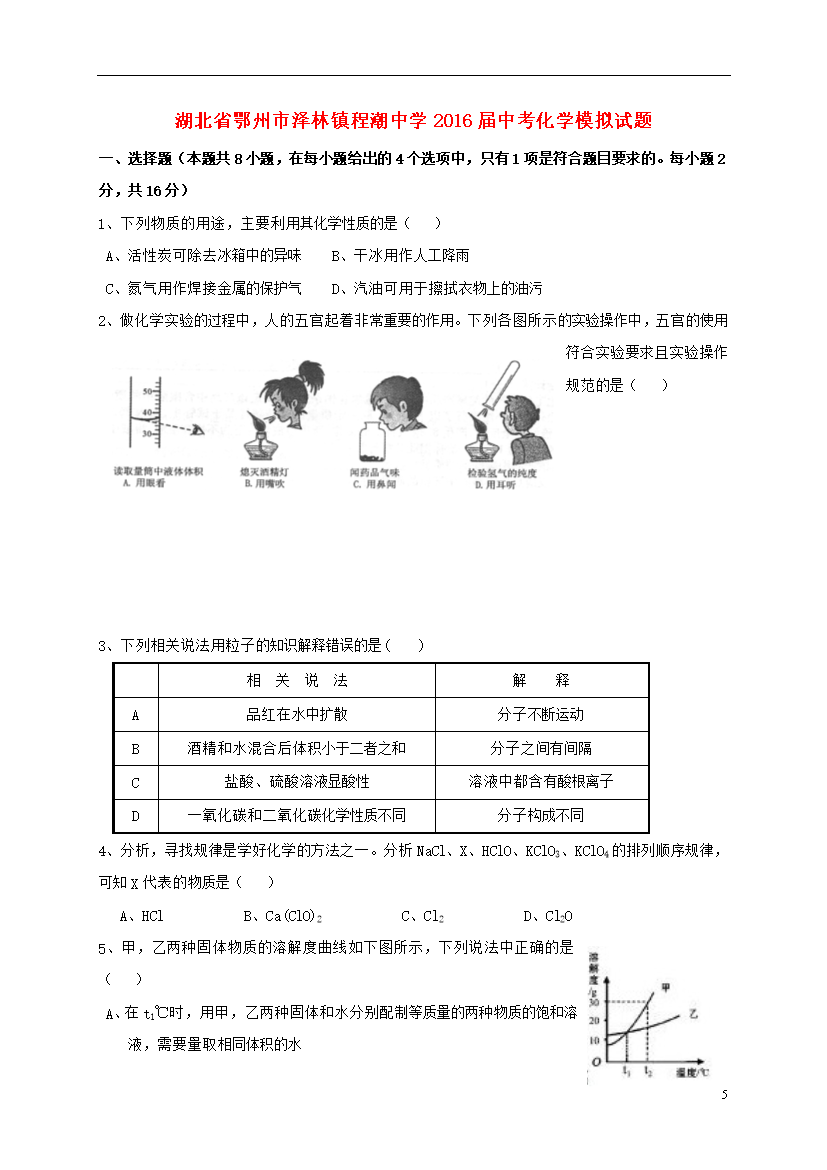 试题-湖北-2016_湖北省鄂州市泽林镇程潮中学2016届中考化学模拟试题(无答案)
