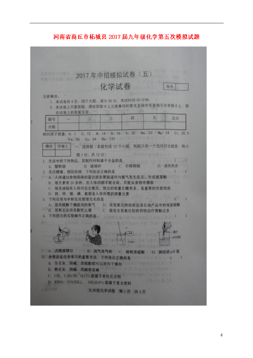 试题-河南-2017_河南省商丘市柘城县2017届九年级化学第五次模拟试题(扫描版)