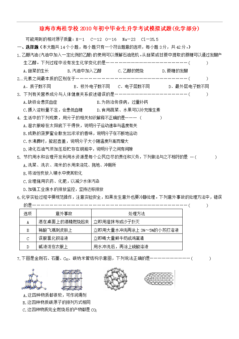 试题-海南-2010_海南省琼海市海桂学校2010年九年级化学初中毕业生升学考试中考模拟试题