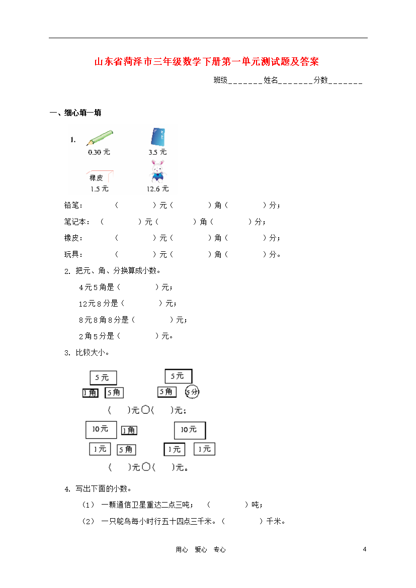 试题-山东-2011_山东省菏泽市三年级数学下册 第一单元测试题