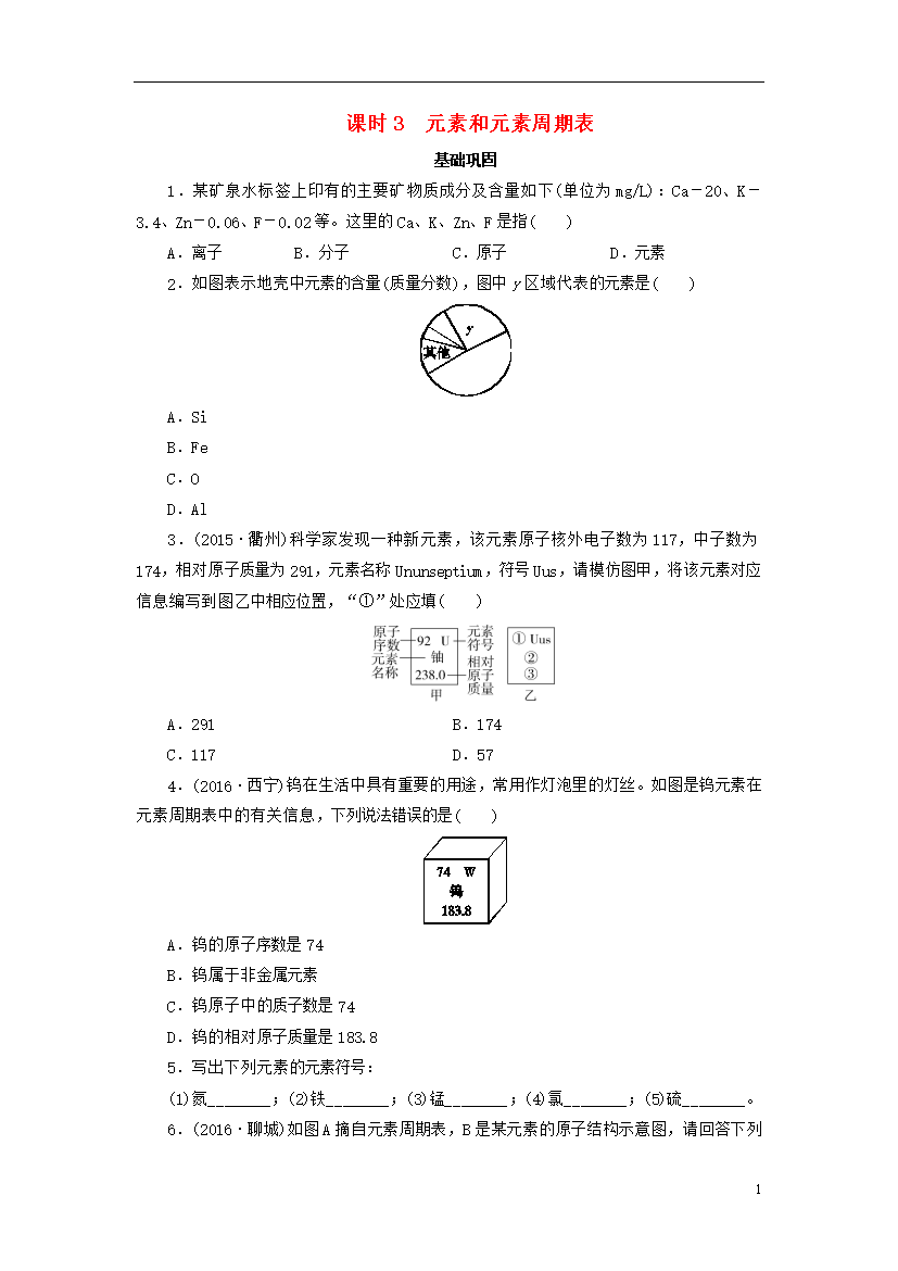 试题-广东-2017_广东省2017年中考化学二轮复习 专题一 物质构成的奥秘 课时3 元素和元素周期表作业