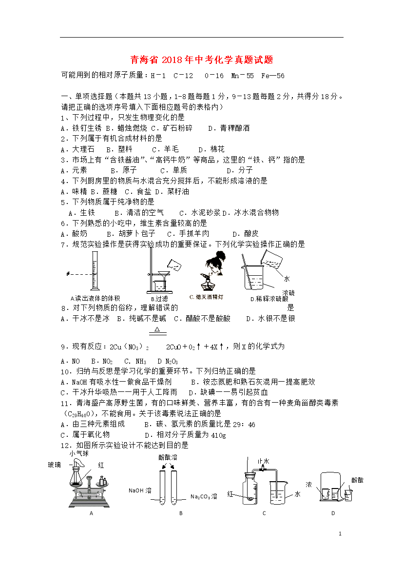 试题-青海-2018_青海省2018年中考化学真题试题(含答案)