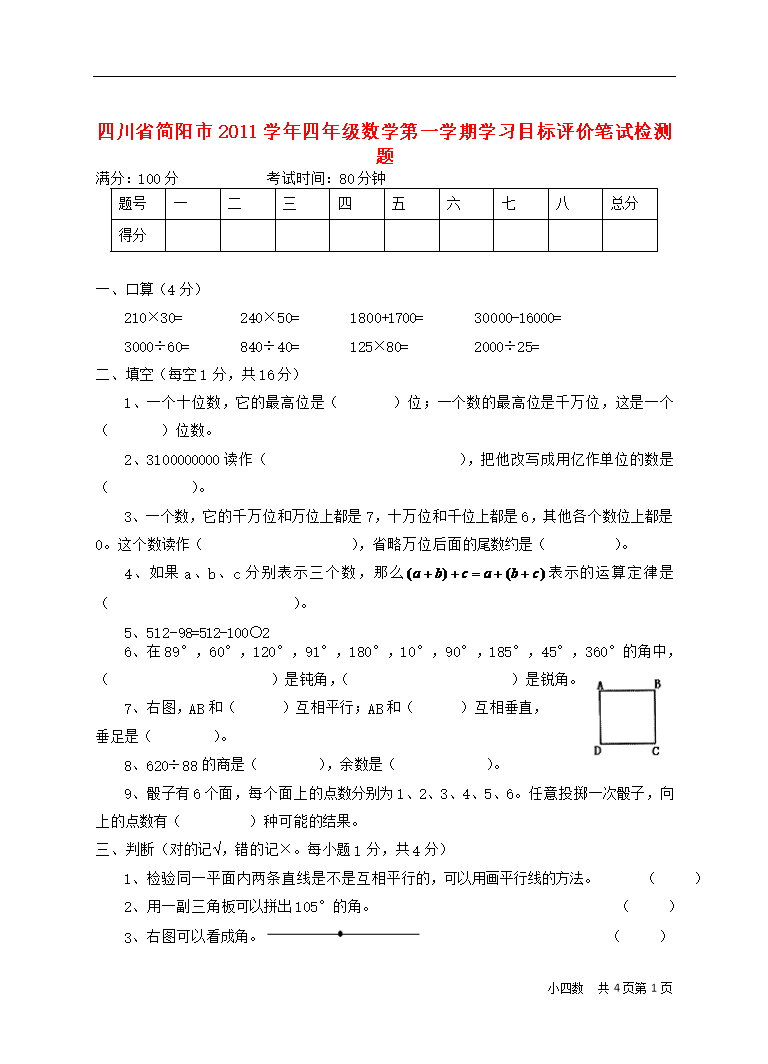 试题-四川-2013_四川省简阳市2011学年四年级数学第一学期学习目标评价笔试检测题