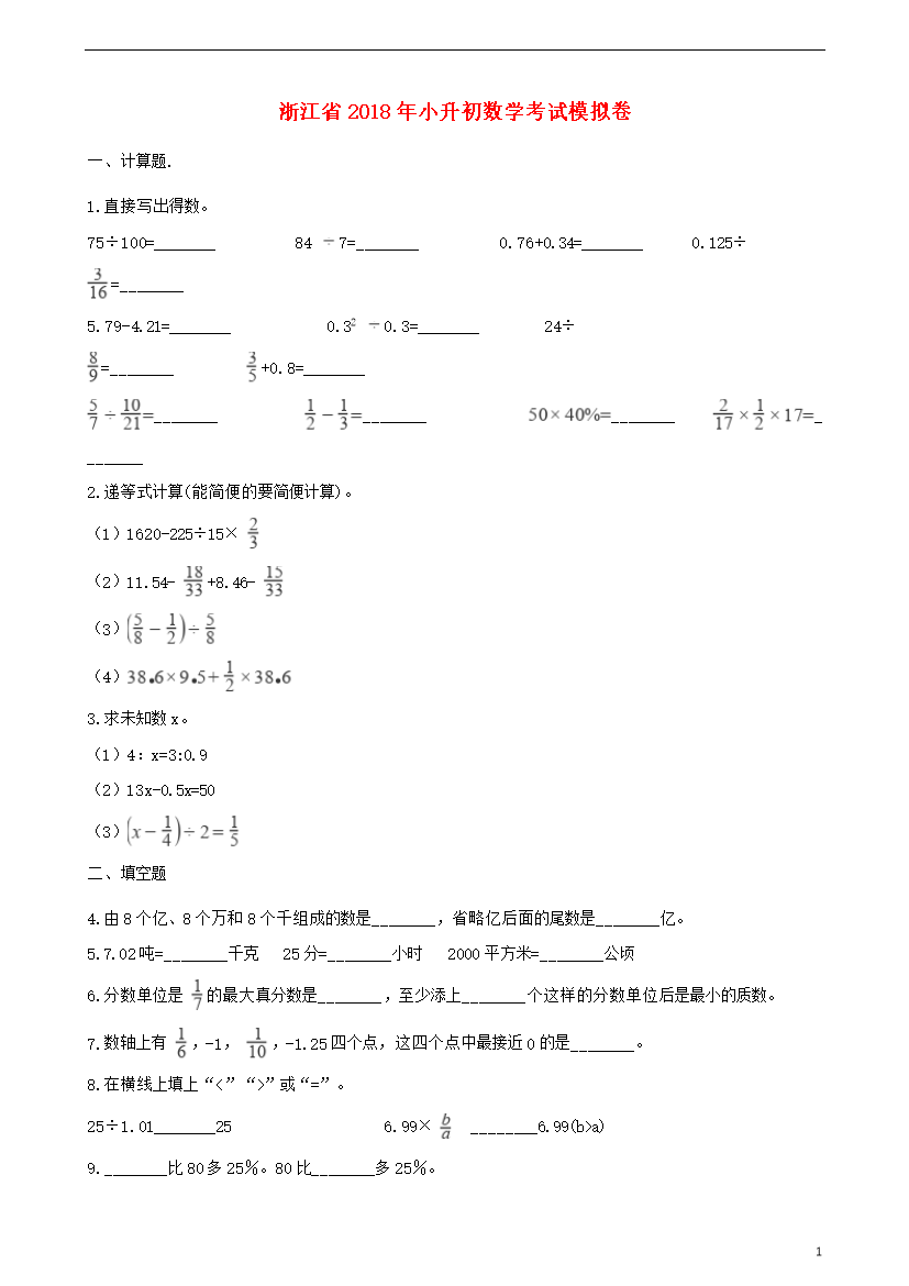 试题-浙江-2018_浙江省2018年小升初数学考试模拟卷6(含解析)