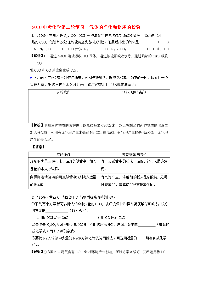 试题-全国-2010_2010九年级中考化学 气体的净化和物质的检验第二轮复习全国通用
