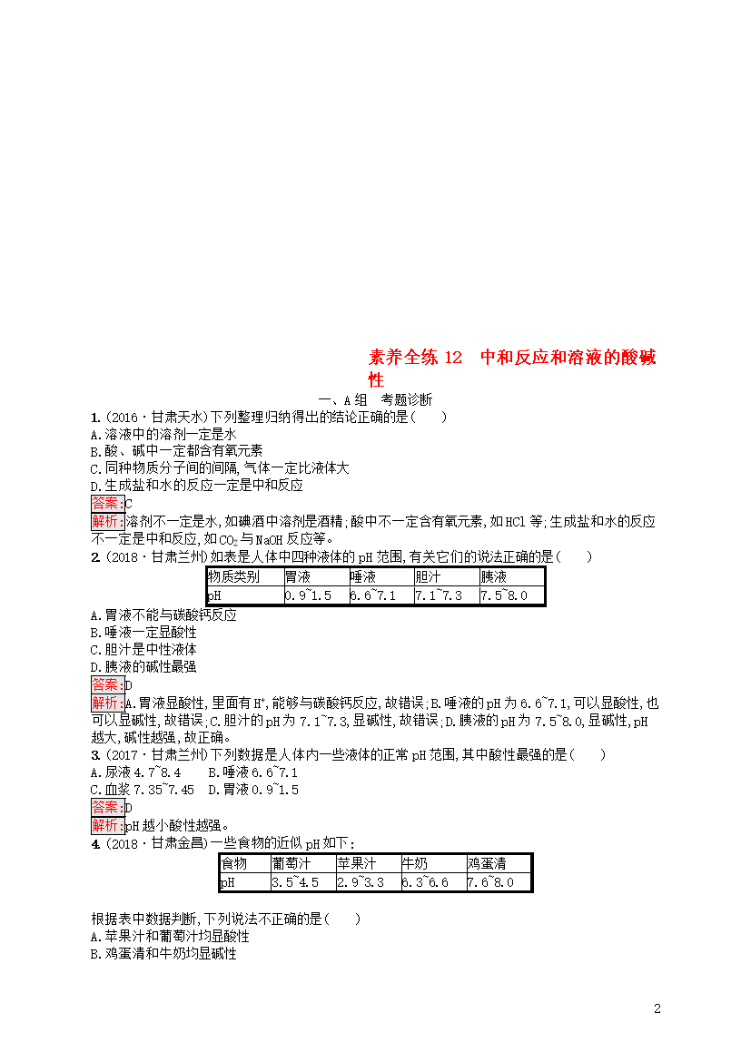 试题-全国-2018_(甘肃地区)2019年中考化学总复习 第十单元 酸和碱 素养全练12 中和反应和溶液的酸碱性练习