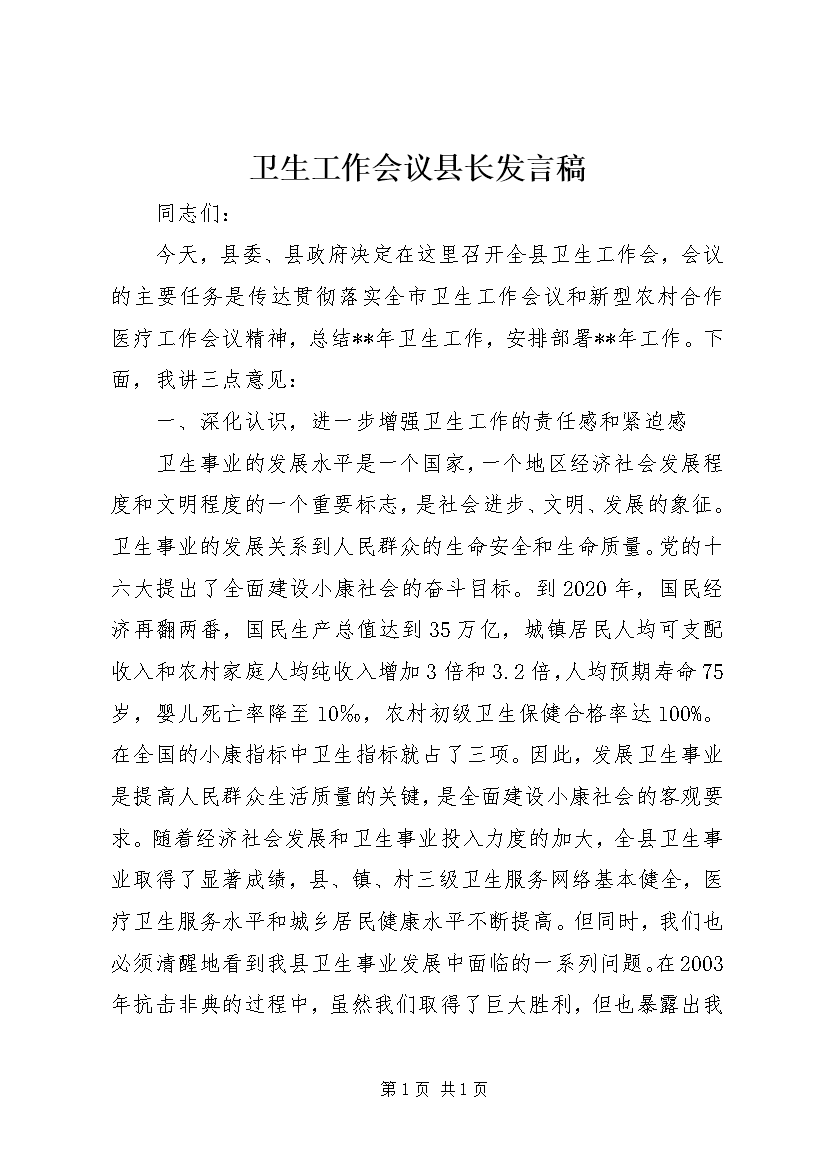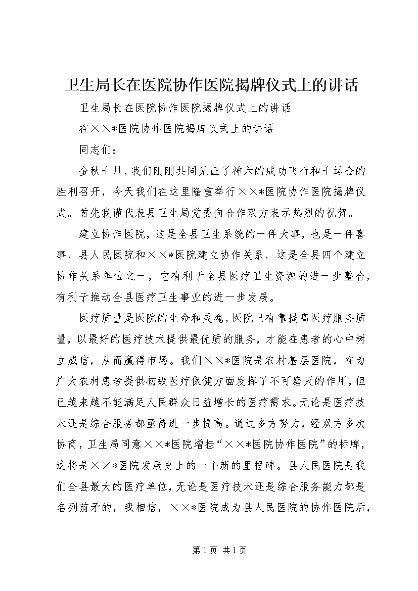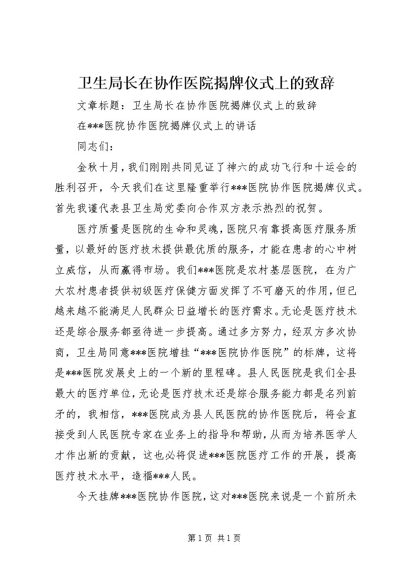 卫生局长在医院协作医院揭牌仪式上的讲话 (2)
