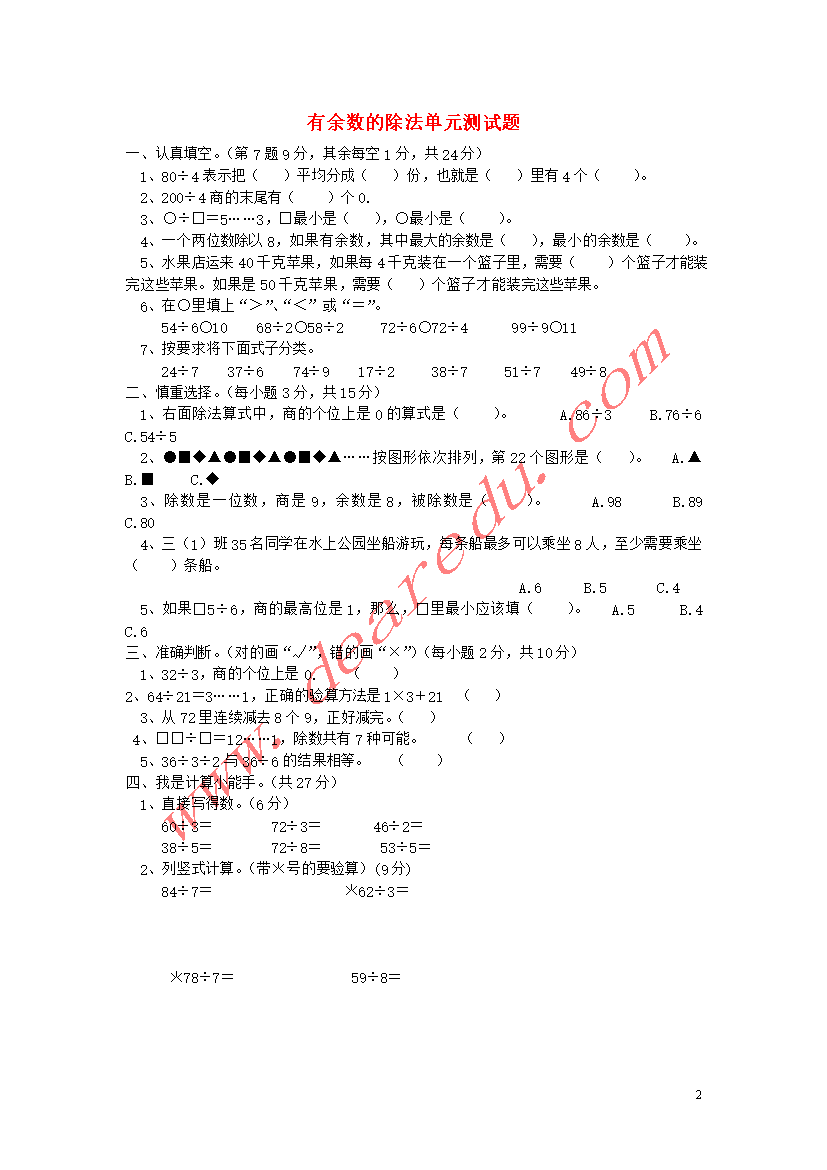 试题-全国-2015_三年级数学上册 第4单元有余数的除法测试题 新人教版